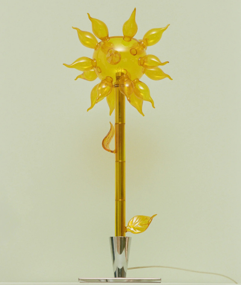 C. “The Sunflower Table Lamp by Zonca Voghera was produced in Italy… made of handblown, Meyer lemon-hued glass, the bright, delightful sunflower shape evokes visual intrigue and delight….When illuminated, the vessel emits a warm, tangerine glow.”
