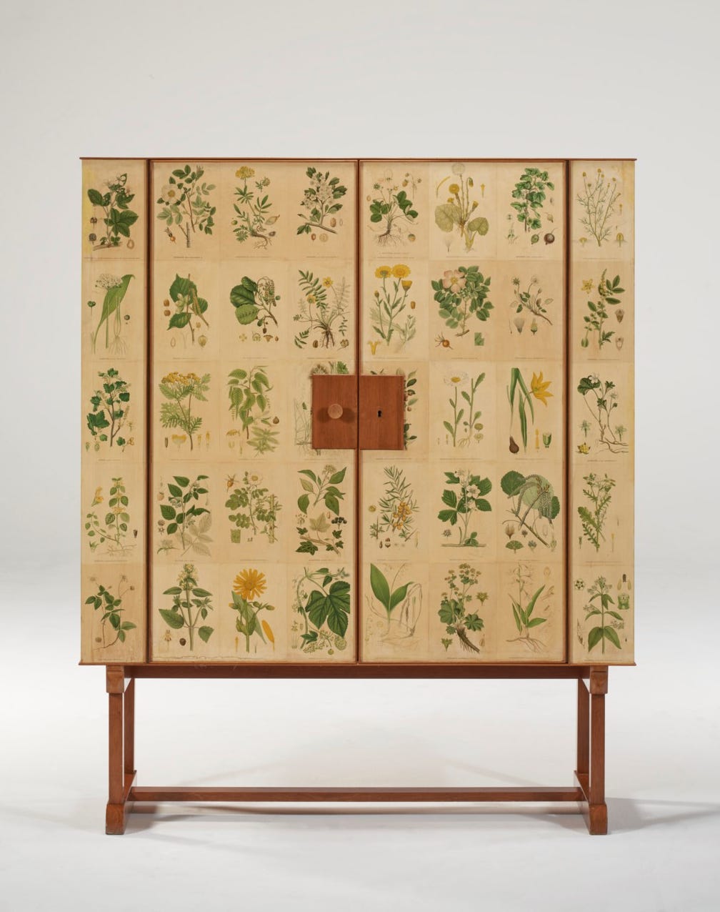 A. ‘Flora’ cabinet, Model No. 852, designed in 1937 and adorned with illustrations from Danish botanist Carl Hansen Ostenfeld’s Bilder ur Nordens Flora (1905). Ostenfeld served as the director of the Copenhagen Botanical Garden and taught botany at the University of Copenhagen. An avid explorer, Ostenfeld traveled outside of Denmark to explore flora and fauna in Iceland, Greenland, the British Isles, Ireland, and Australia.